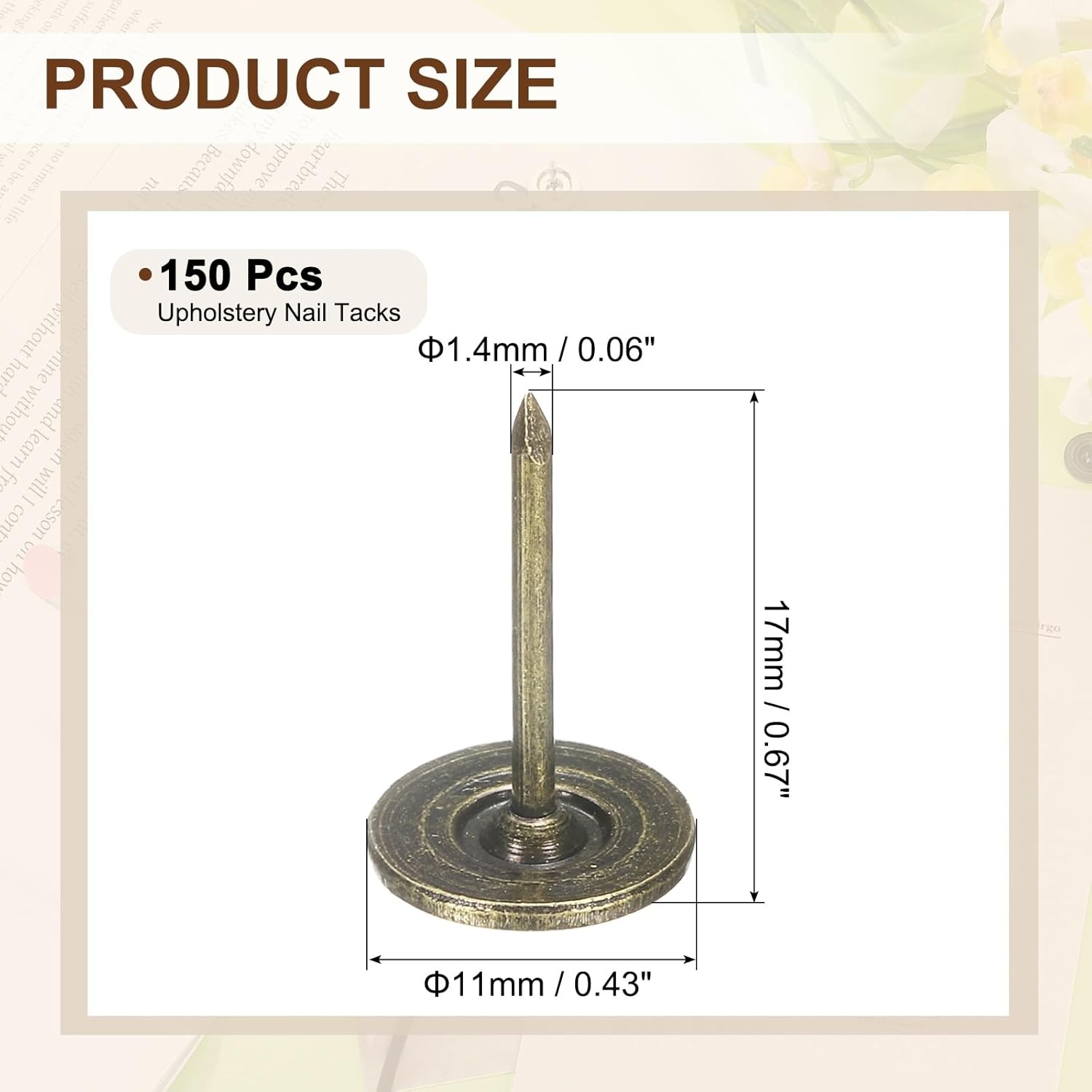 - [Size & Quantity] - The package comes with 150pcs decorative upholstery tacks. Sufficient quantity to meet your different daily needs. The overall size of upholstery nails is about 11mm x 17mm/0.43-inch x 0.67-inch(D*H)