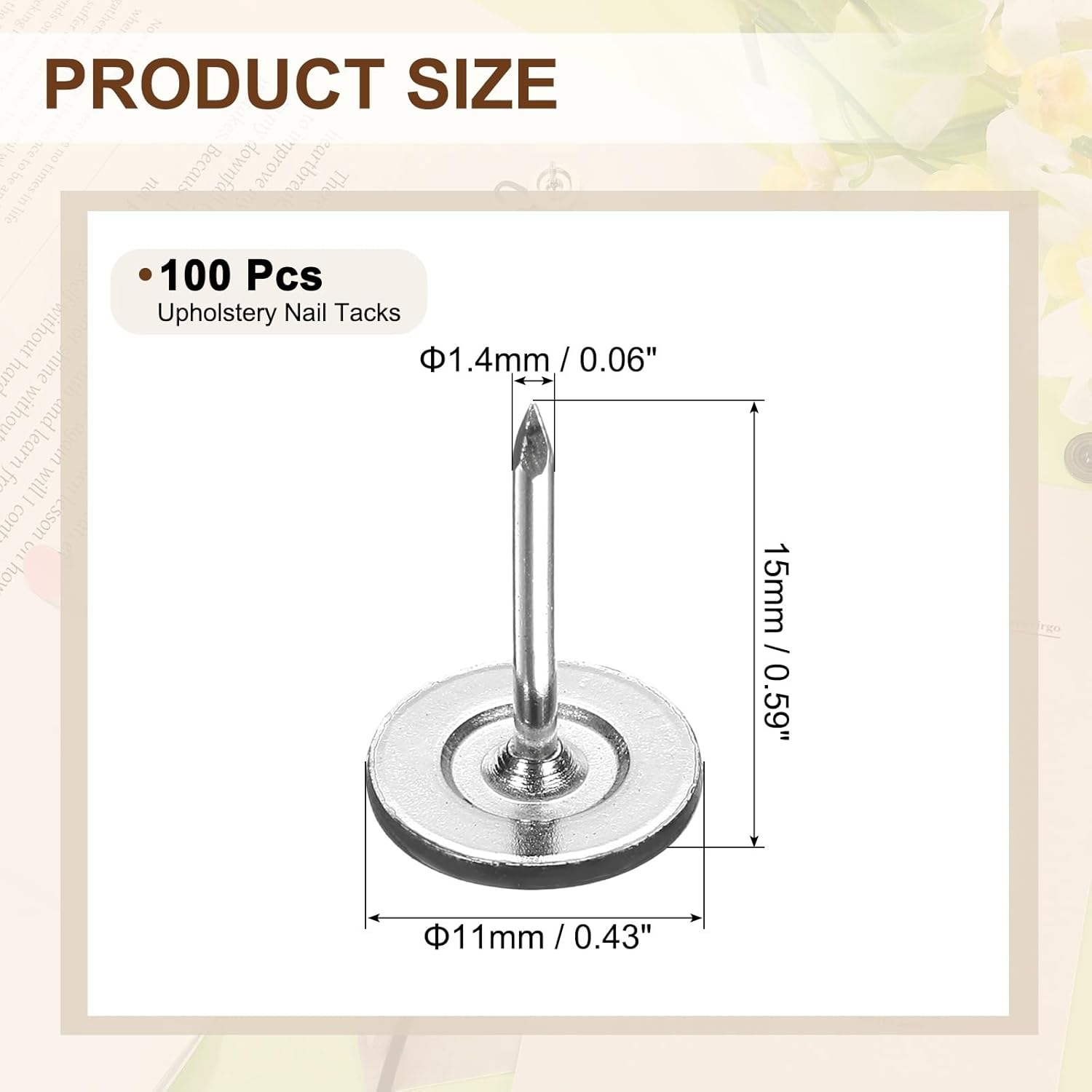 - [Size & Quantity] - The package comes with 100pcs decorative upholstery tacks. Sufficient quantity to meet your different daily needs. The overall size of upholstery nails is about 11mm x 15mm/0.43-inch x 0.59-inch(D*H)