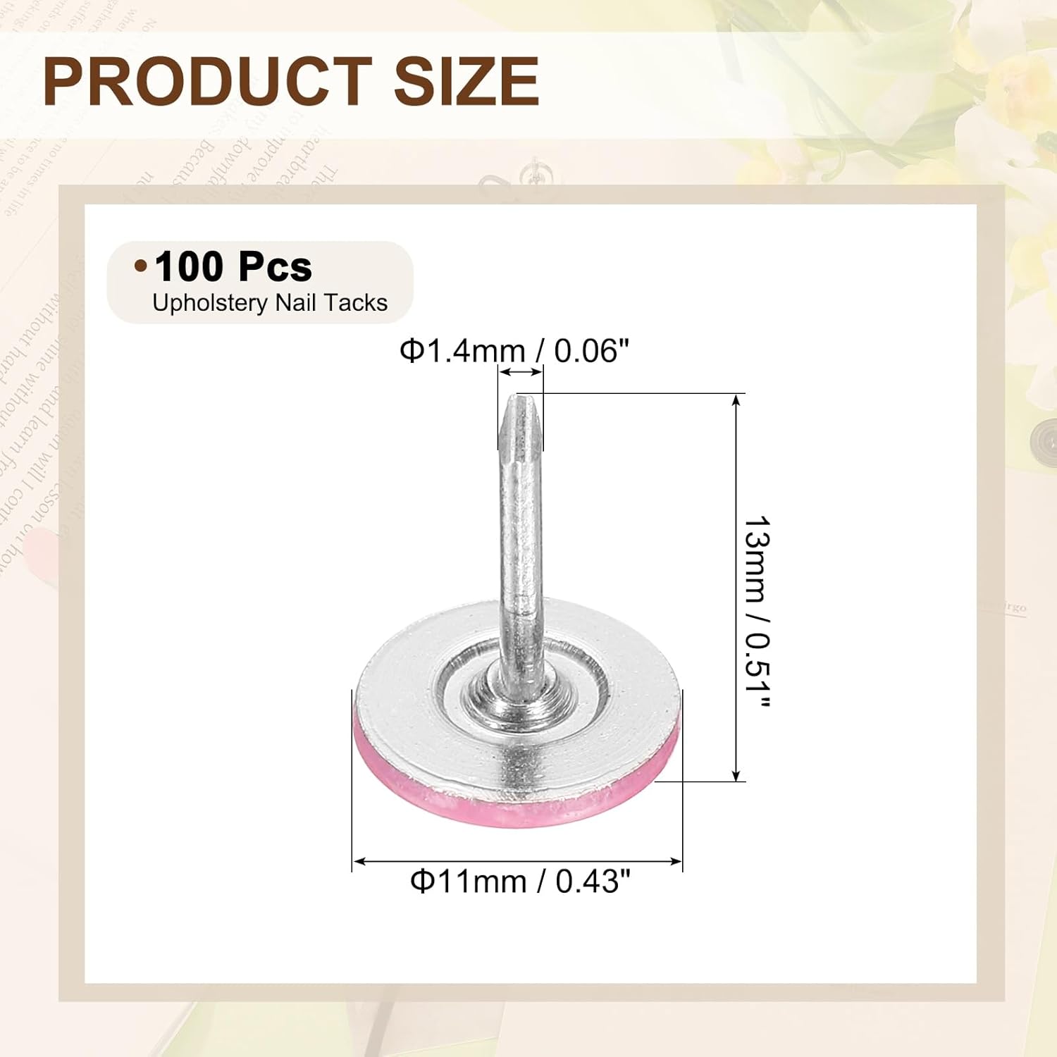 - [Size & Quantity] - The package comes with 100pcs decorative upholstery tacks. Sufficient quantity to meet your different daily needs. The overall size of upholstery nails is about 11mm x 13mm/0.43-inch x 0.51-inch(D*H)