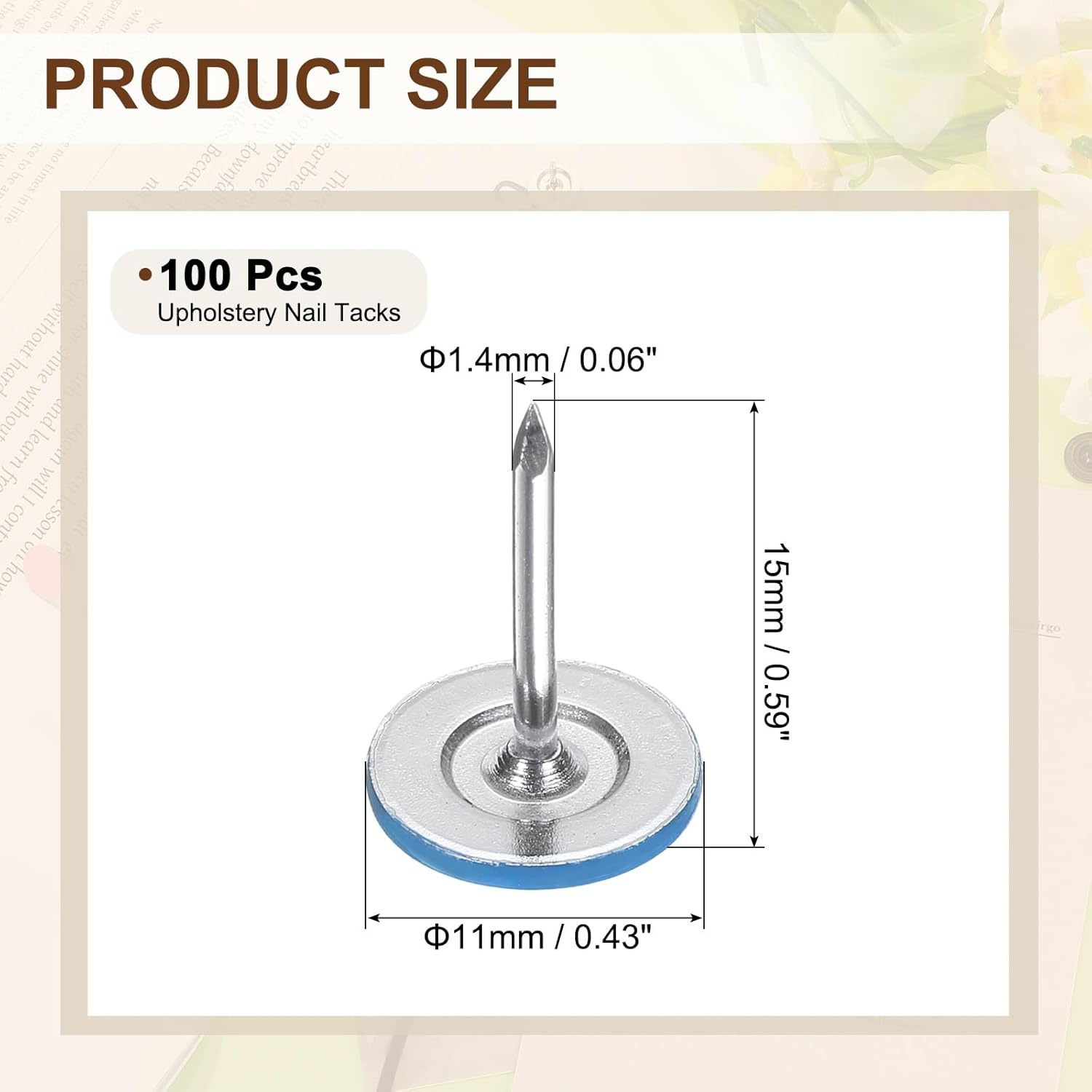- [Size & Quantity] - The package comes with 100pcs decorative upholstery tacks. Sufficient quantity to meet your different daily needs. The overall size of upholstery nails is about 11mm x 15mm/0.43-inch x 0.59-inch(D*H)