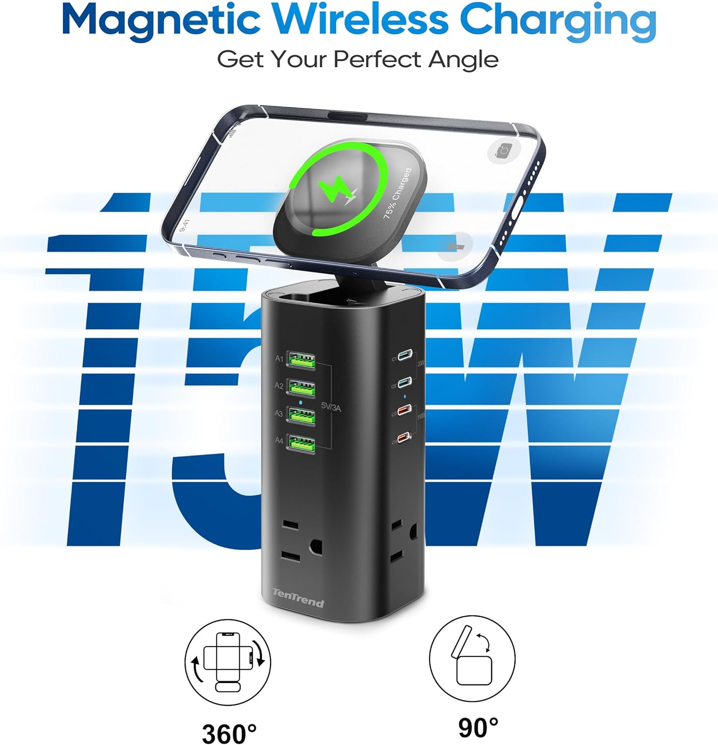 - 【12 in 1 Charging Tower】Featuring 3 AC sockets, 4 USB-C ports & 4 USB-A ports, 1 magnetic charging top. This power strip tower can charge up to 12 devices simultaneously.