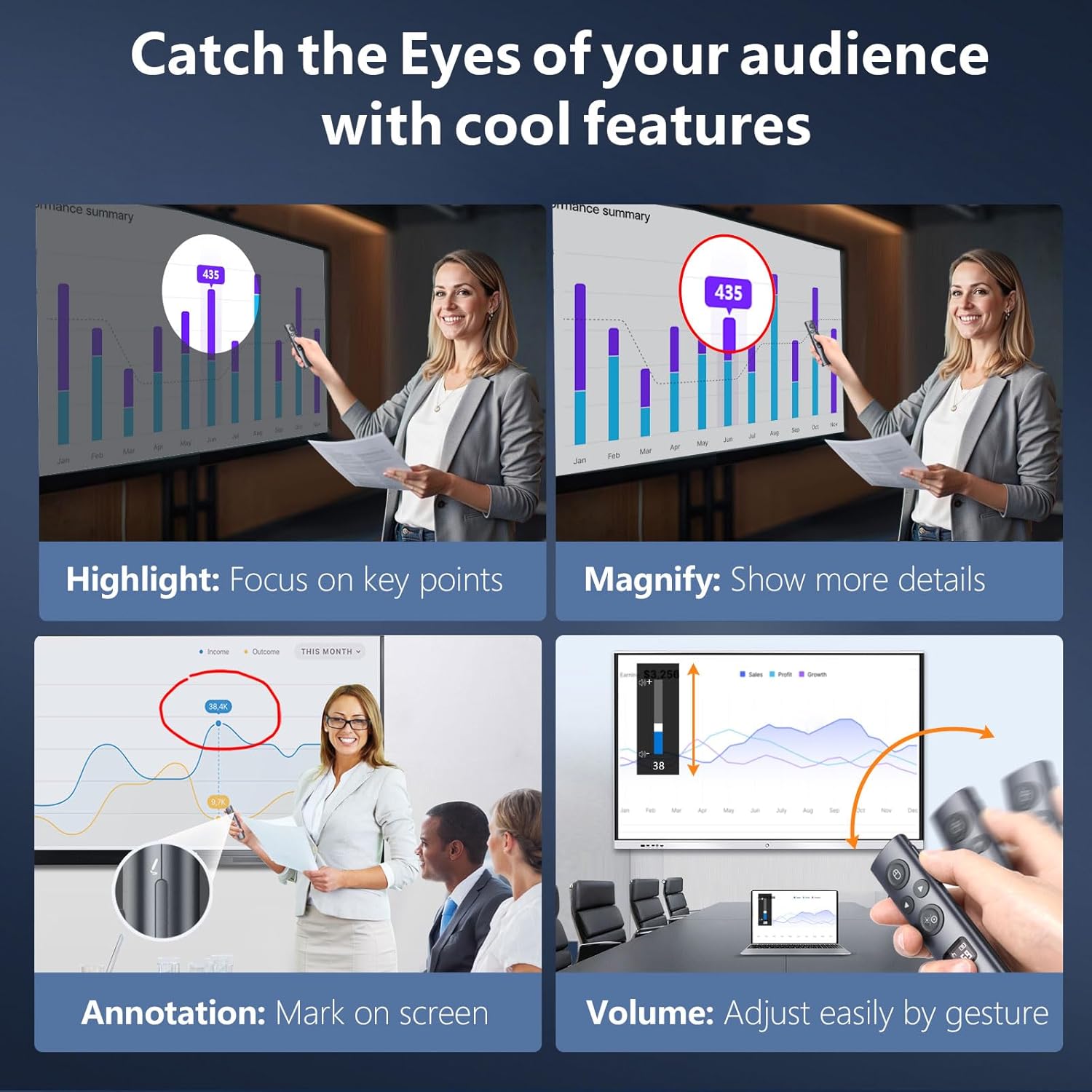 - Special Feature : Annotation/Eraser, Countdown timer and remain power display, Digital pointer for TV screens, Highlight, Magnify and Mouse left click, Key Function Customizable Annotation/Eraser, Countdown timer and remain power display, Digital pointer for TV screens, Highlight, Magnify and Mouse left click, Key Function Customizable