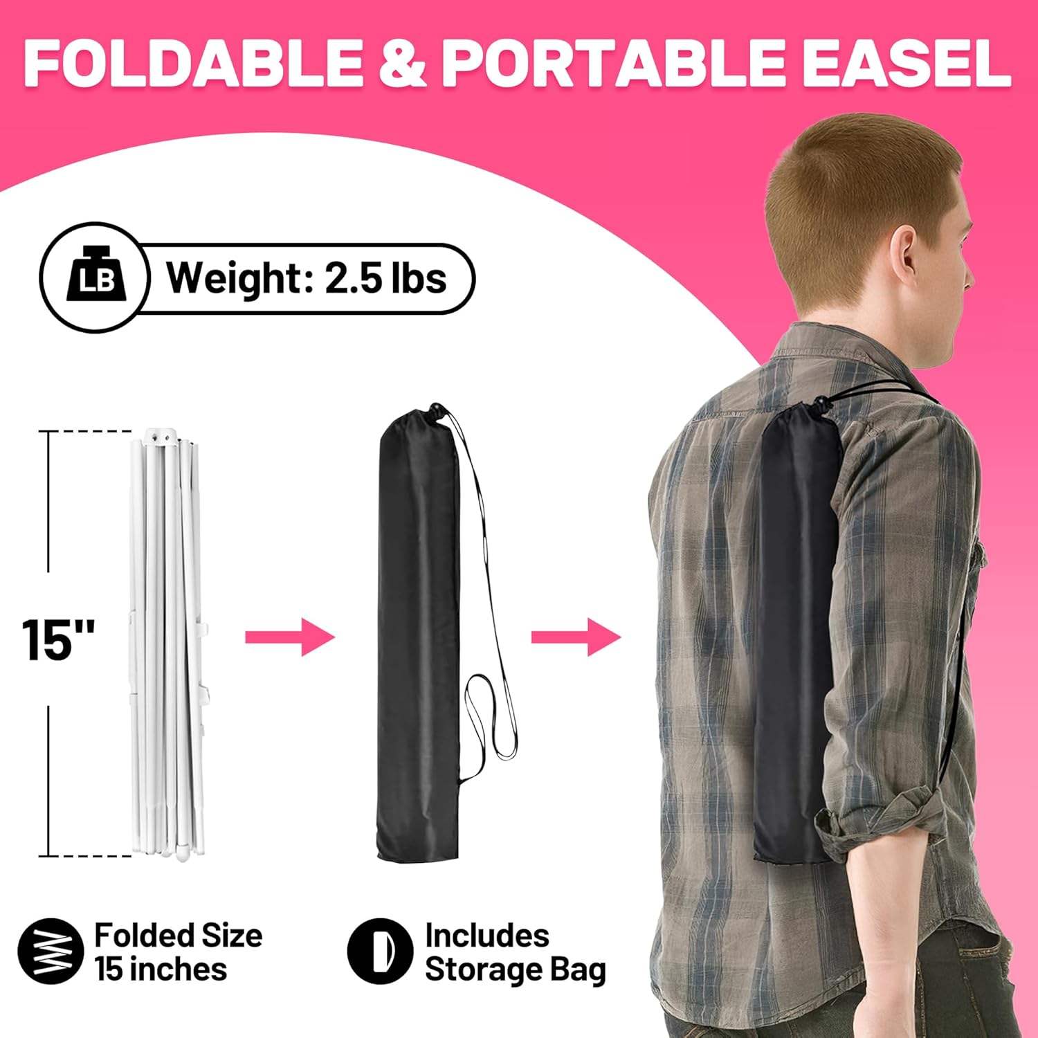 - Foldable and Portable Easel: This portable easel weighs just 2.5 pounds and folds down to 15 inches. It comes with a storage bag for easy storage and on-the-go carrying
