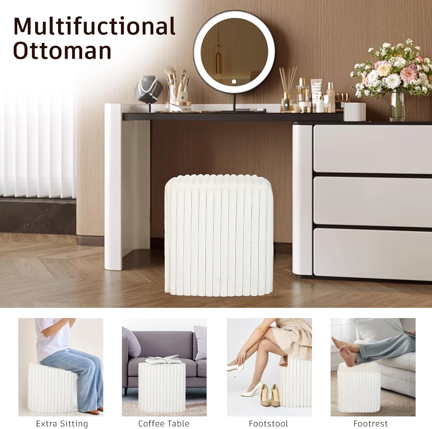 Modern Square Ottoman, Vertical Channel Tufted Foot Stool Ottoman, Velvet Upholstered Vanity Stool for Makeup, Bedroom, Living Room, White
