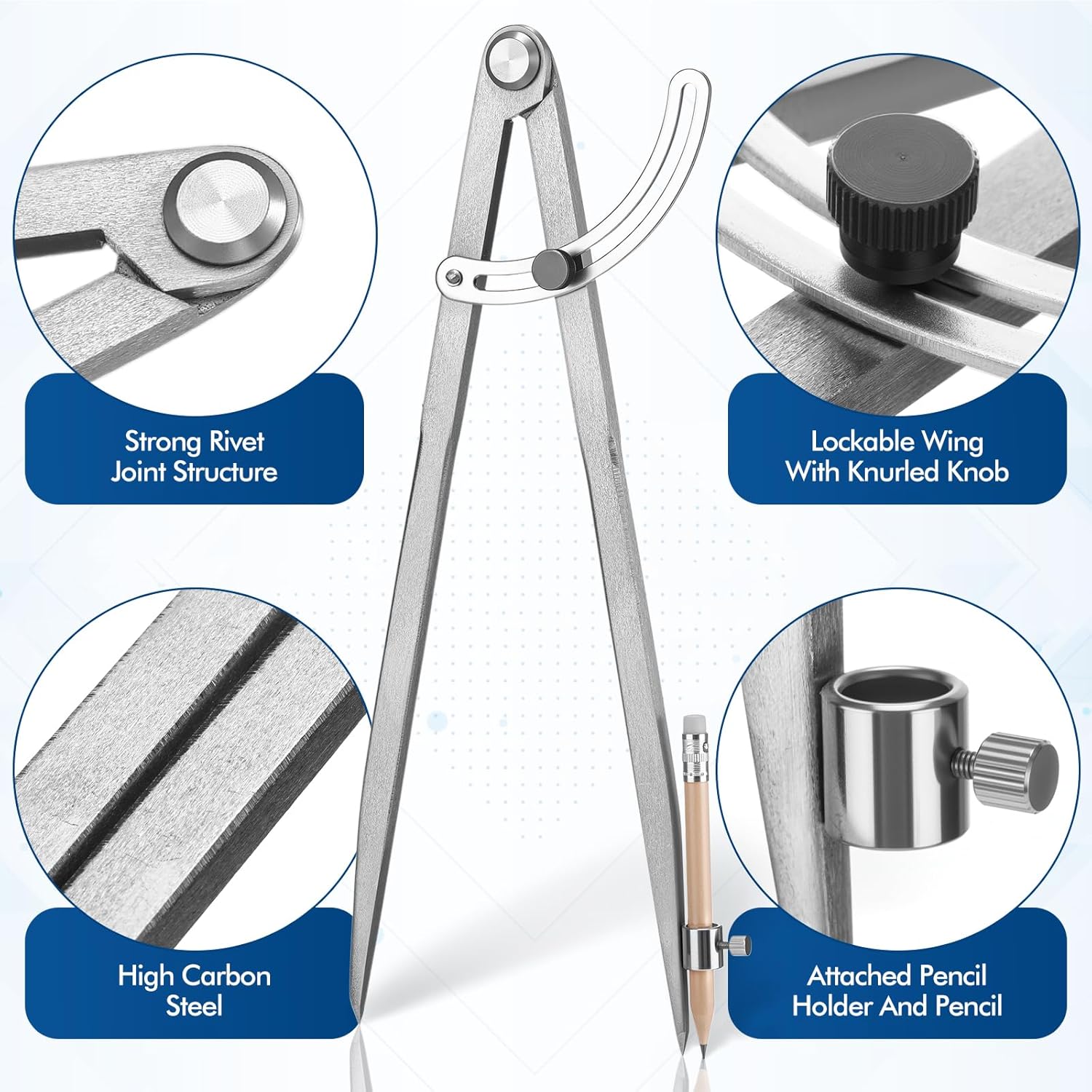 - 12 Inch Large Winged Compass: our large professional compass leg measure 12 inches and can draw circles up to 30 inches (76 cm) in diameter; Made of carbon steel, the metal compass is sturdy and durable, not easy to bend or break during use, suitable for long term use