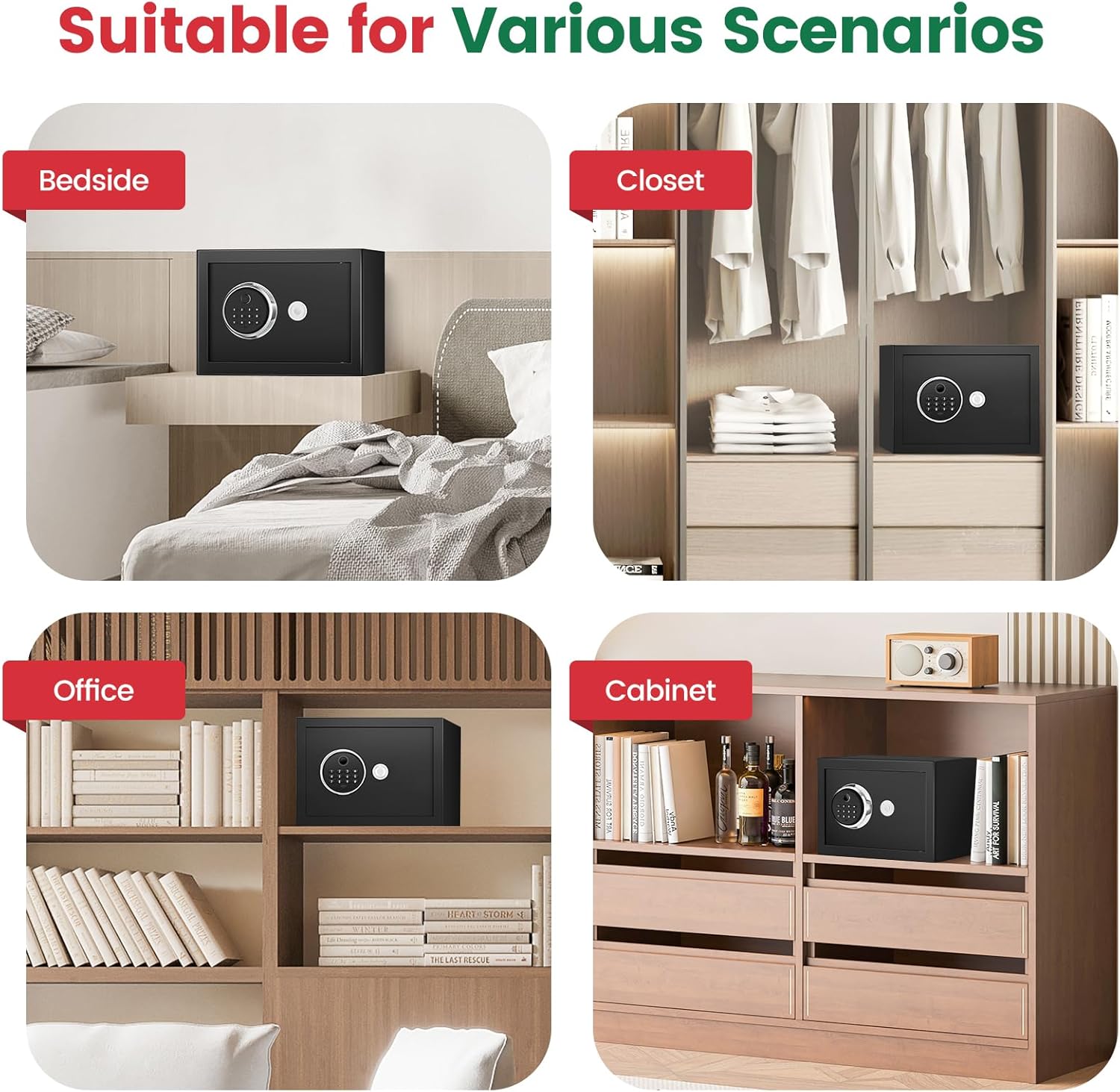 - ăSTRONGER MATERIALă: This safe is made of stronger steel with a corrosion and abrasion resistant powder coated finish. And security safe features a extra thick pry-resistant steel door, 3*20mm high-strength solid-core locking latch, and hidden pry-resistant hinges for complete peace of mind. You can secure it to the wall or floor if necessary