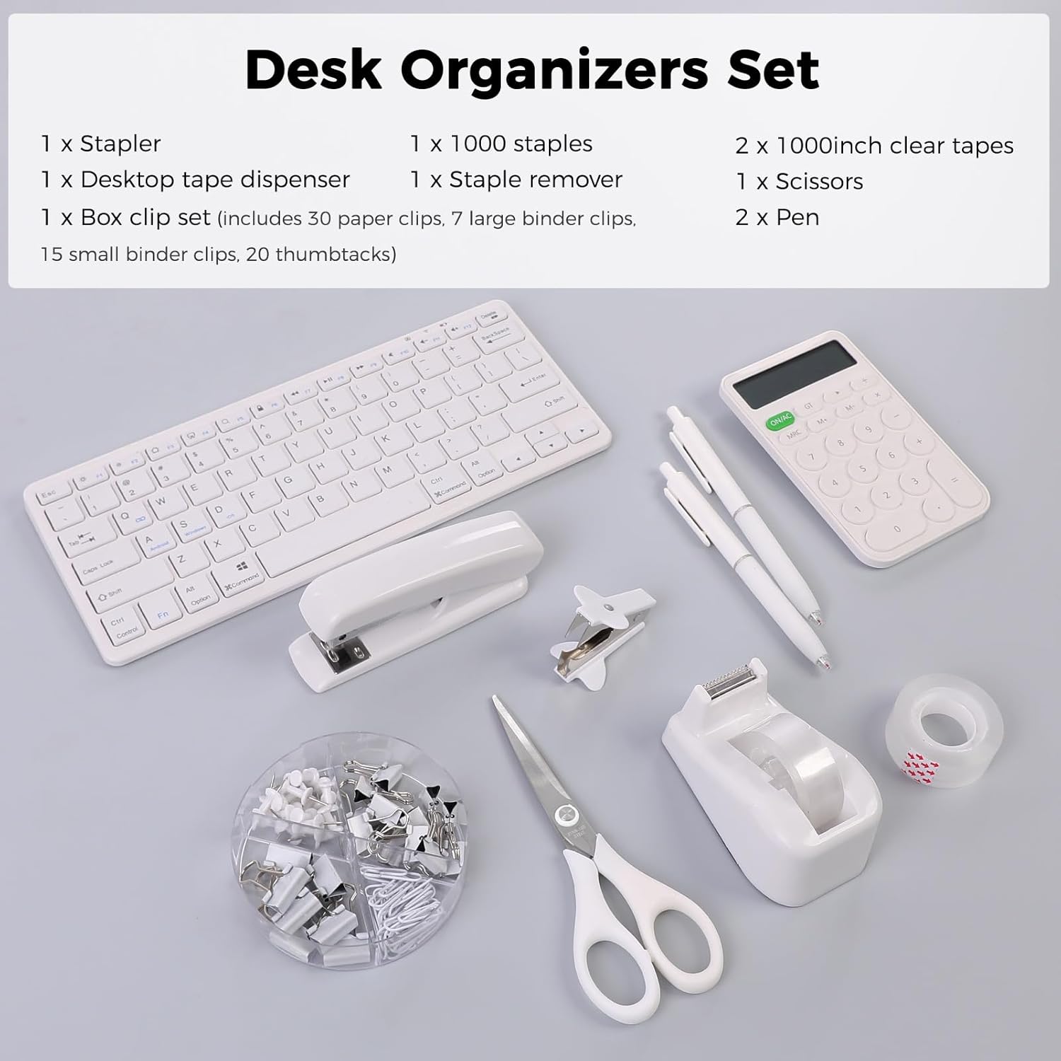 SKYDUE White Office Supplies Set, Desk Accessories, Stapler, Tape Dispenser, Scissors, Binder/Paper Clips and 1000pcs Staples, Office Decor for Women