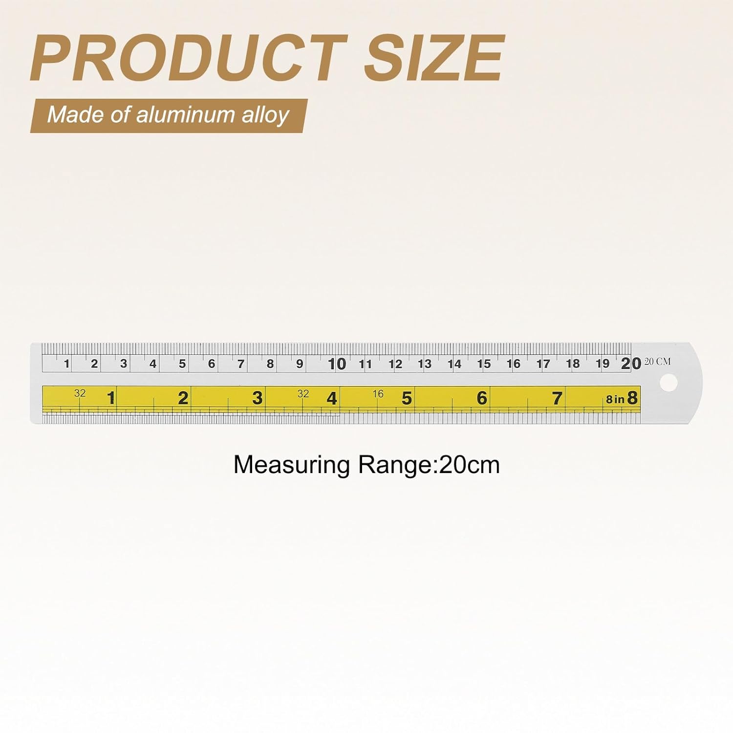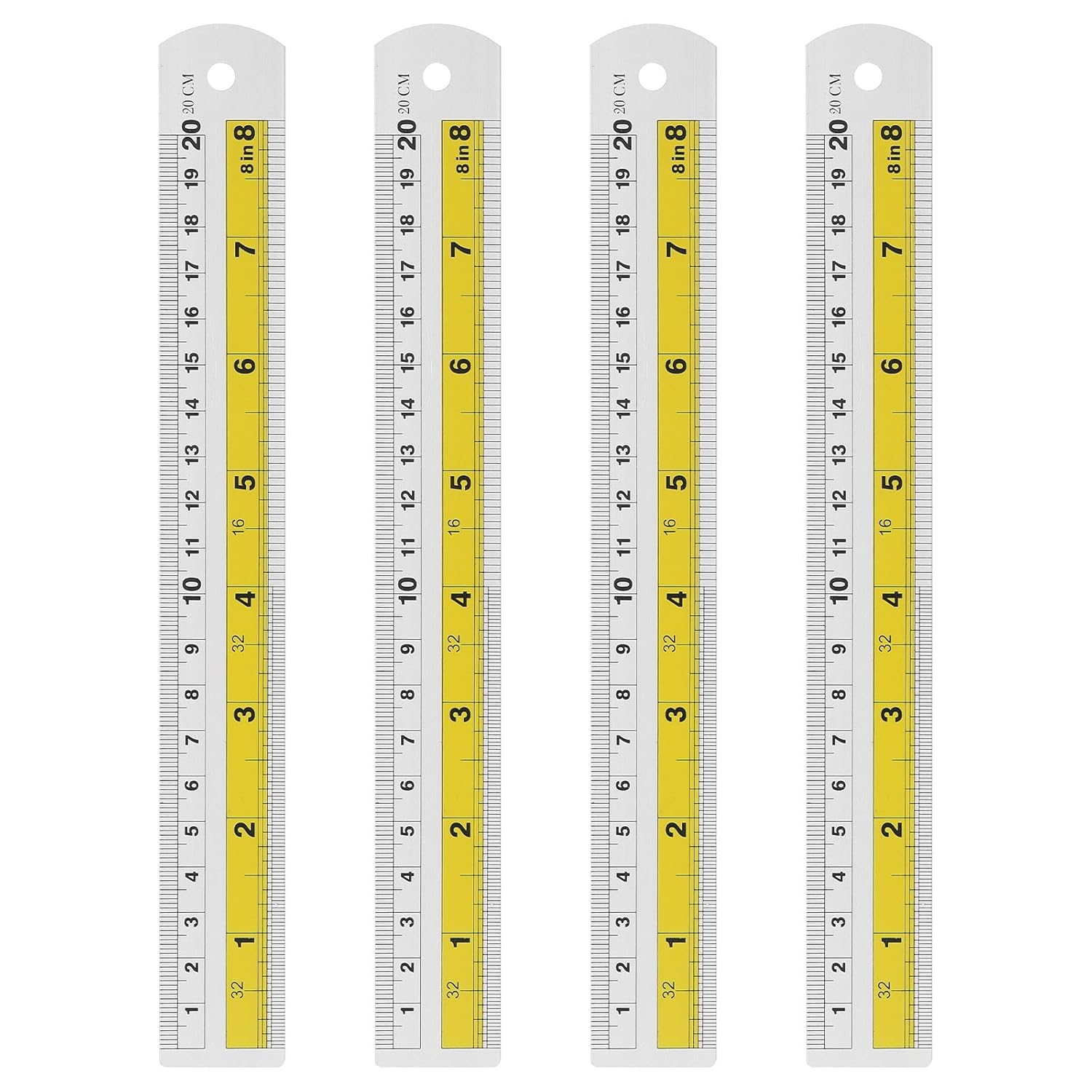 HARFINGTON 4pcs Metal Straight Ruler 20cm Metric SAE Aluminum Alloy Measuring Rulers Scale Tool with Hole for Measure Study Reading Classroom Office, Yellow