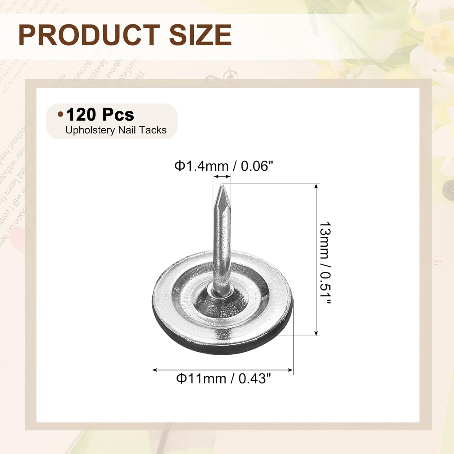 - [Size & Quantity] - The package comes with 120pcs decorative upholstery tacks. Sufficient quantity to meet your different daily needs. The overall size of upholstery nails is about 11mm x 15mm/0.43-inch x 0.59-inch(D*H)