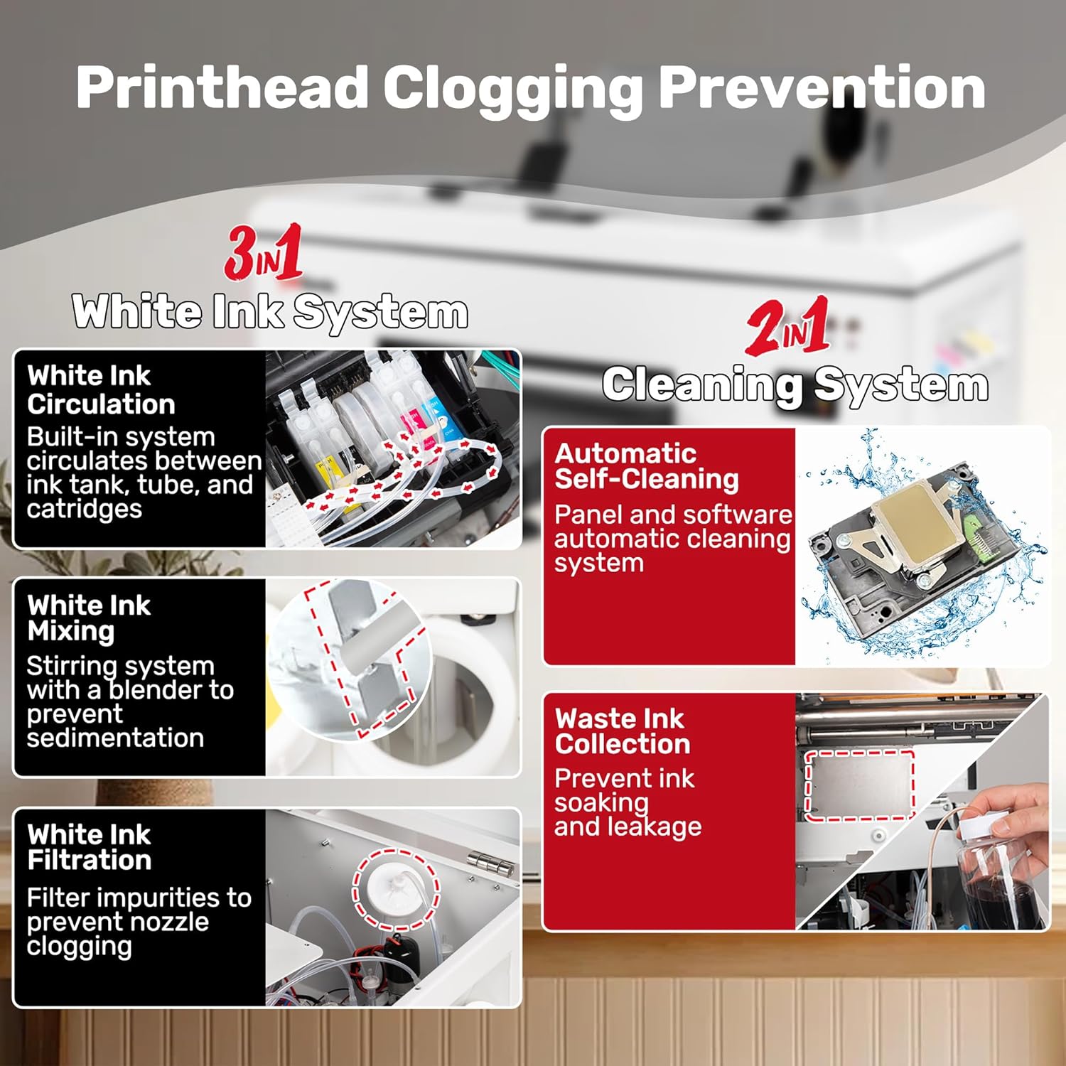 - ā [Printhead Protection System] 3-in-1 white ink circulation, mixing, and filtering with CISS (Continuous Ink Supply System) to prevent the printhead from being clogged by white ink. The moisturizing device ensures that even if the printer is not used for a long time, the inside of the printhead can still remain moist to prevent clogging.