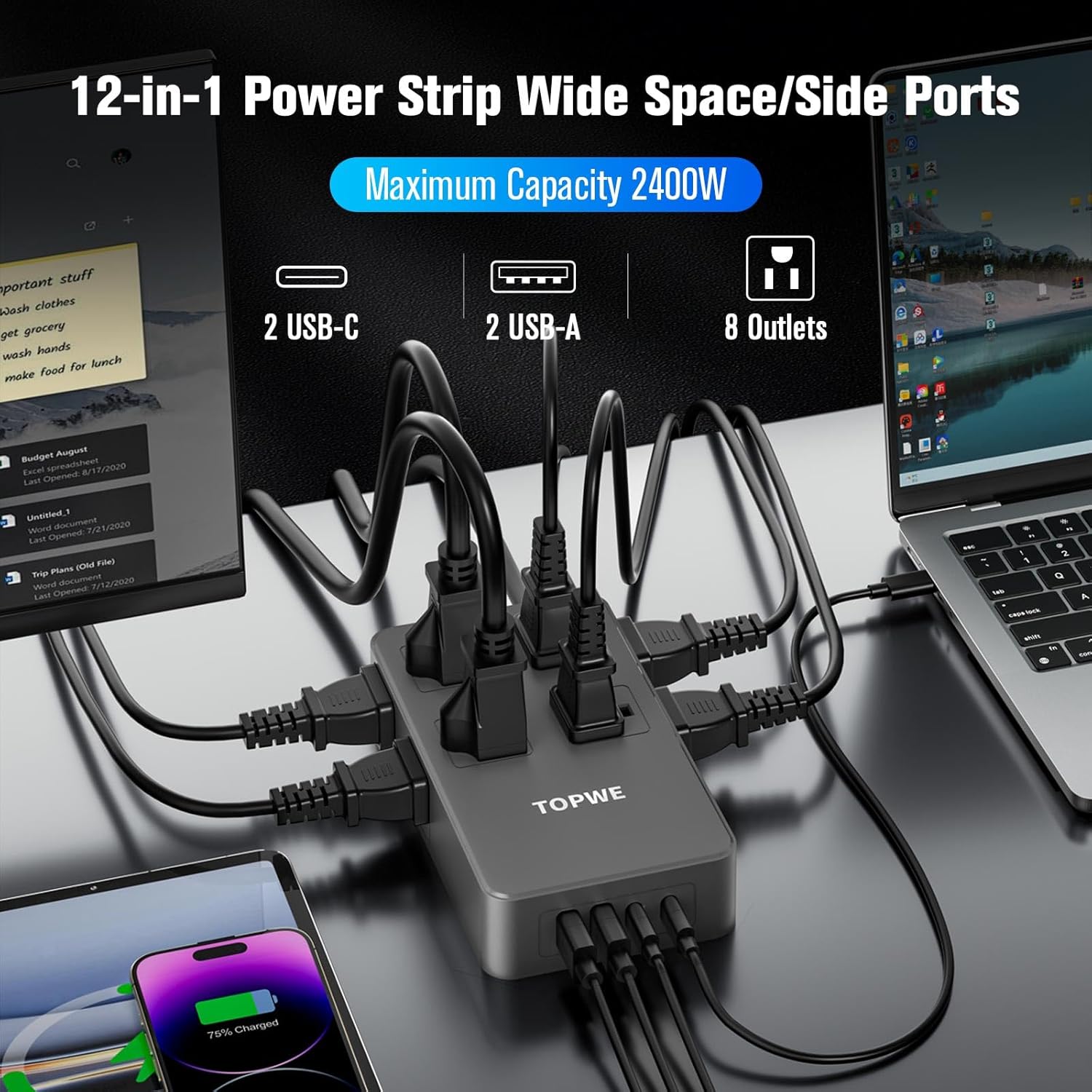 - 【8-Outlet Power Strip with USB 】Designed for convenience and safety, the surge protector power strip comes with 8 grounded AC outlets and 2 USB charging ports & 2 USB-C port, which provide power and charging for up to 12 devices from a single wall outlet.