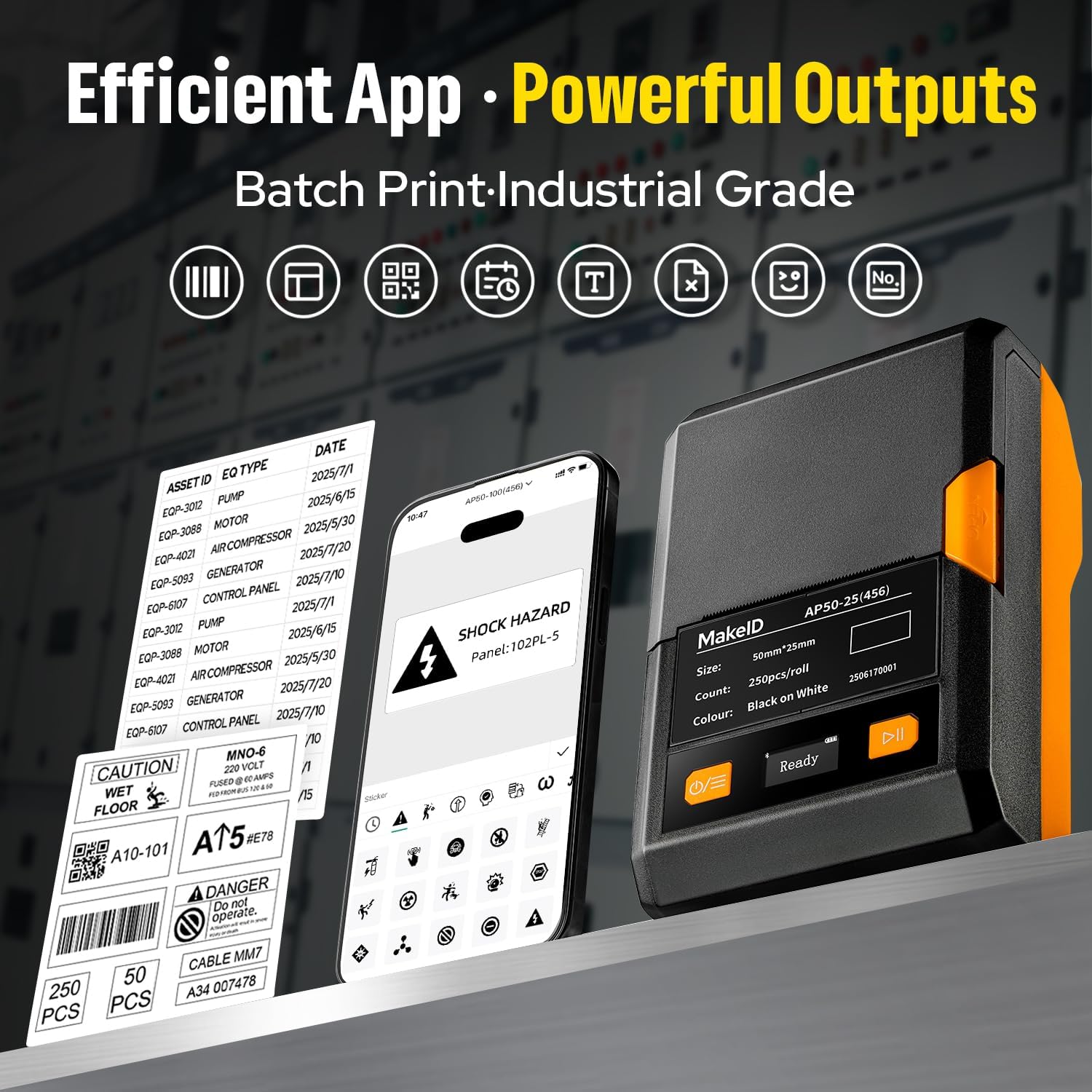 - Powerful Mobile App Features– The MakeID App includes 48 templates, 200+ icons, 20+ fonts, supports barcodes & QR codes, and allows bulk data import for fast and efficient on-site labeling.