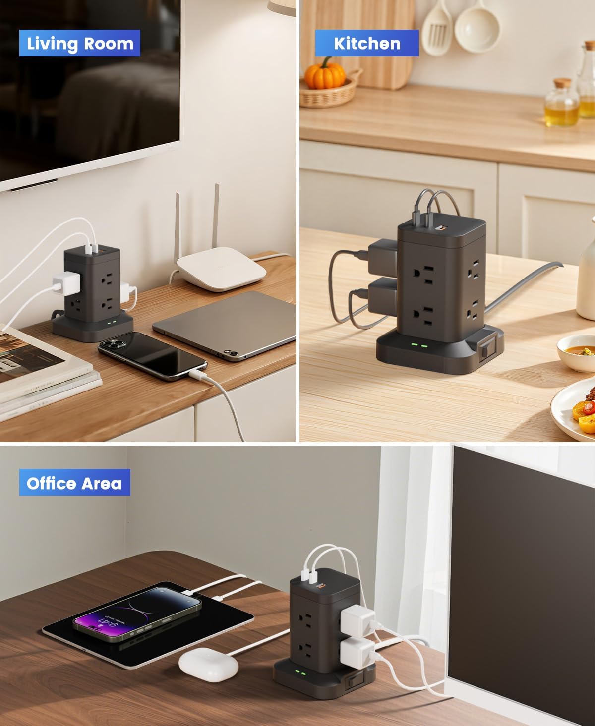 - 11-IN-1 Power Strip Tower: This power strip tower surge protector features 8 AC outlets and 3 smart USB ports (2 USB-C) (Max 5V/3.4A) for up to 11 devices,It serves as a surge protector charging station for office, school, and dorm room essentials.
