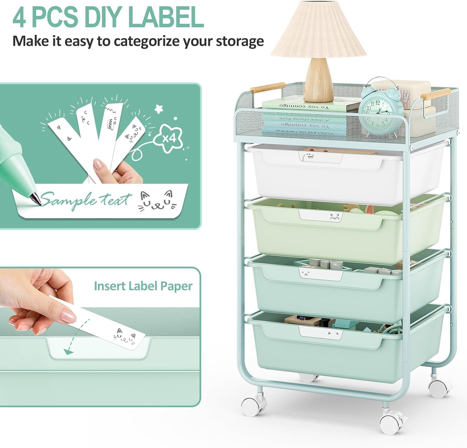 Rolling Utility Storage Cart with 4 Drawers - 4 Tiers Rolling Cart Craft Cart, Storage Drawer Cart Organizer for Craft Room Office Bedroom Classroom with Mesh Top & 4 PCS DIY Lable, Green
