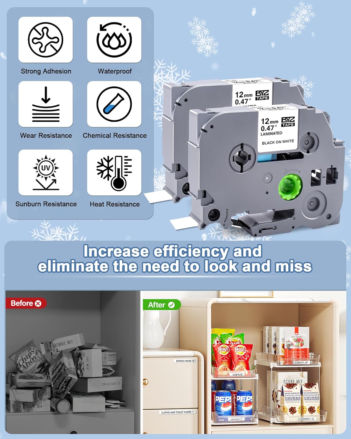 - Features : Label maker refill is Water Resistant,Chemical Resistant,Abrasion Resistant,Temperature Resistant,Fade Resistant.Print clear and long-lasting,split backing for easy peeling. No sticky residue remains when the labels are removed,make your things all be tidy and clean at a glance