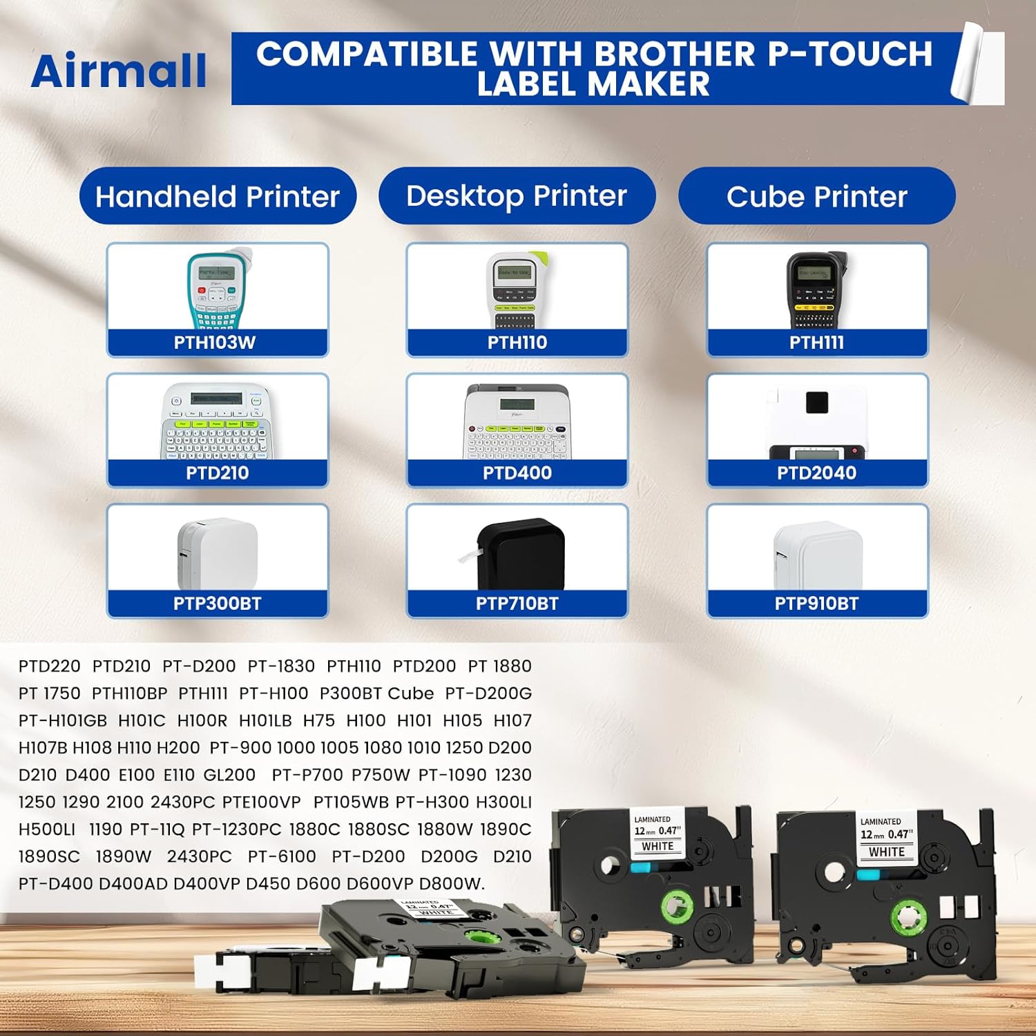 - 【Compatible with Brother P touch Label Maker】PT-D200, PT-D210, PT-D400, PT-D600, PT-H100, PT-H110, PT-P300BT, PT-P700, PT-P710BT, PT-H300, PT-H500LI, PT-D450, PT-D800W, PT-1190, PT-1230PC, PT-1750, PT-1880, PT-1890, PT-2040, PT-2430PC, PT-6100, PT-9600, and more (Not work for any M-K tape Ptouch Printers such as PT-65, 45, M95 ect)
